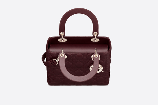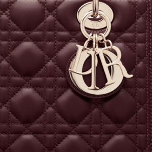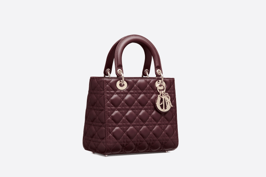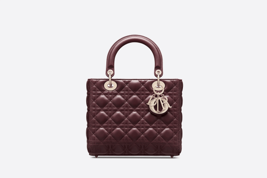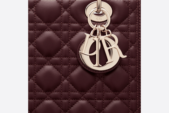 The Lady Dior handbag embodies Dior’s vision of elegance and beauty. Sleek and refined, the timeless yet relevant style is crafted in amaranth lambskin with Cannage stitching, creating the instantly recognizable quilted texture. The pale gold-finish metal ‘D.I.O.R.’ charms offer an elegant allure. Featuring a thin, removable leather shoulder strap, the medium Lady Dior bag can be carried by hand, worn over the shoulder or crossbody.