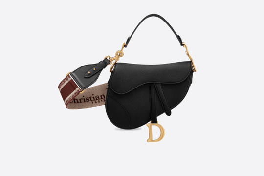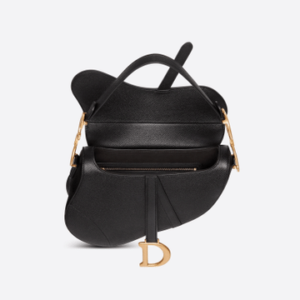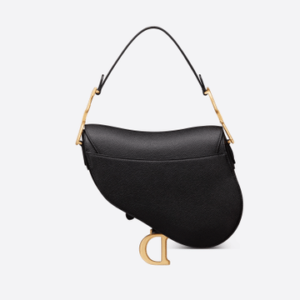 The iconic Saddle bag is reinvented once more by Maria Grazia Chiuri. Featuring a Saddle flap with a magnetic ‘D’ stirrup clasp, it boasts a ‘CD’ signature on each side of the handle. The black grained calfskin style is embellished with antique gold-finish metal hardware. The Saddle bag may be carried by hand or worn over the shoulder and can be customized with different shoulder straps.
