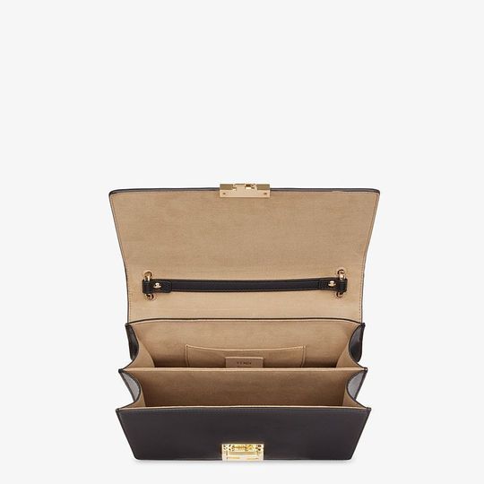 Bag with flap made of black leather embossed and hand-painted with the FF motif in brown. Decorated with iconic FF press fastening.