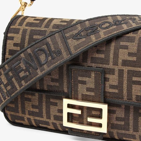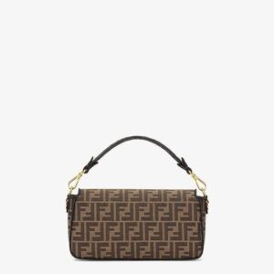 Iconic medium Baguette bag made of brown jacquard fabric with an FF motif, decorated with an FF clasp and trimmed with black embroidery.