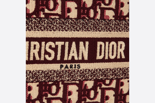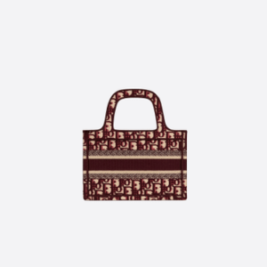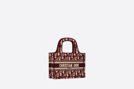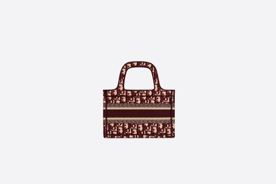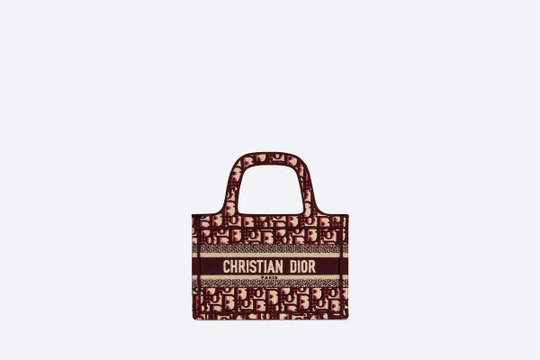 The Dior Book Tote, an original style introduced by Dior?s creative director Maria Grazia Chiuri, has become a staple of the Maison?s aesthetic. The burgundy mini shape is made of fully embroidered canvas and portrays the logo mania original Dior Oblique pattern with the Christian Dior signature on the front. This carryall is a perfect example of the Dior savoir-faire. It may be paired with small leather goods accessories for a complete look.
