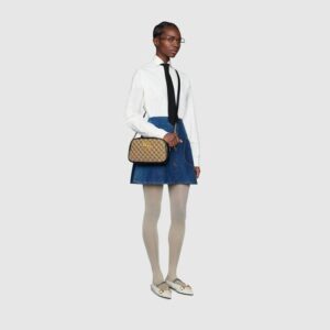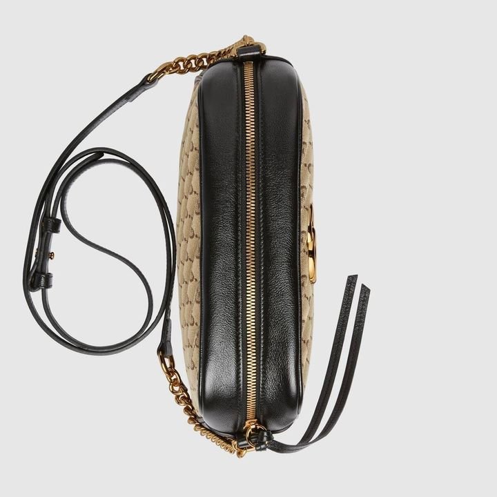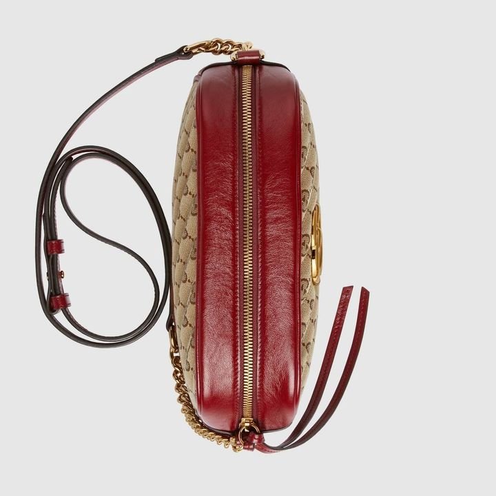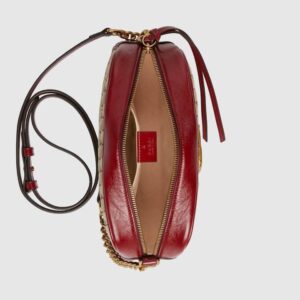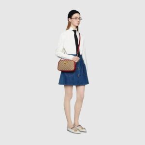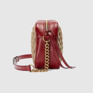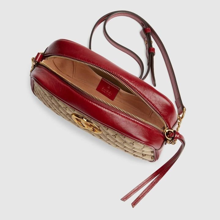 The zip-top Marmont chain shoulder bag is reimagined in an iteration that plays with the House’s logo. Original canvas is presented with a quilted diagonal matelass? technique, trimmed with red leather. The front is defined by the archival Double G hardware from the ’70s, now presented in a luminous gold tone.