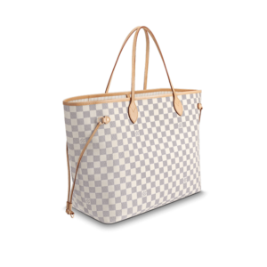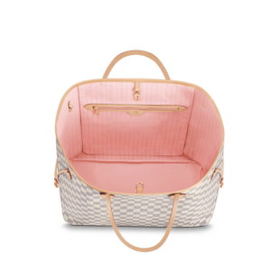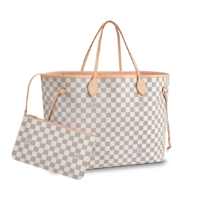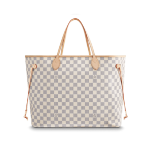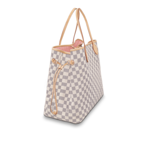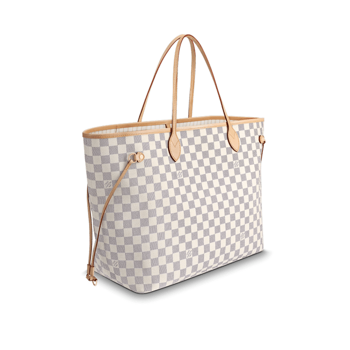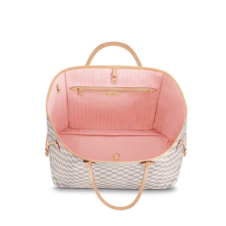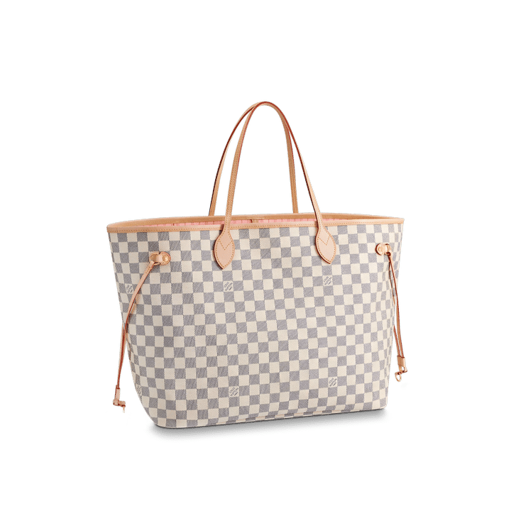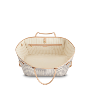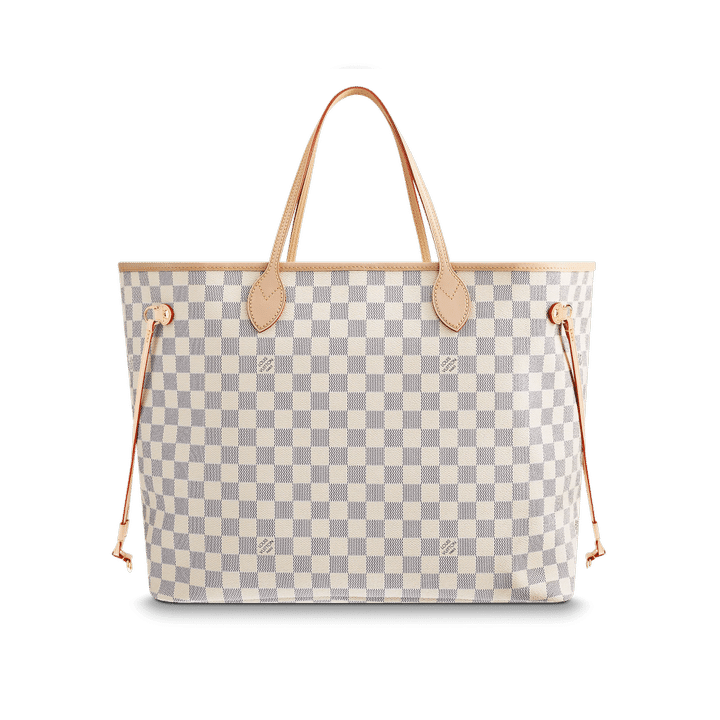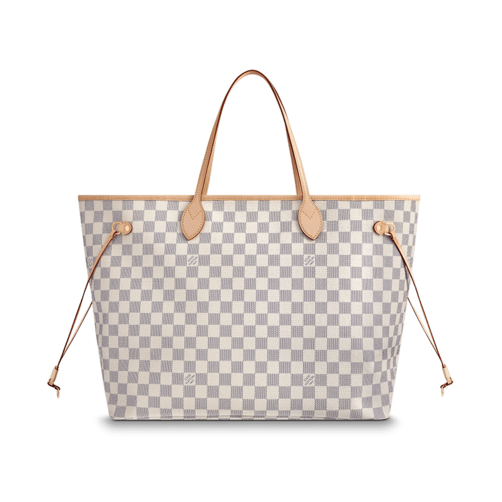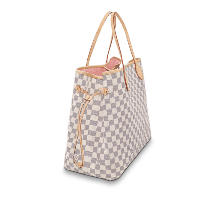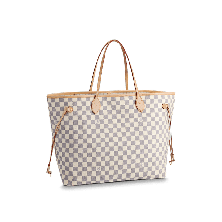 The Neverfull GM tote unites timeless design with heritage details. Crafted from fresh Damier Azur canvas with natural cowhide trim, it is ultra-roomy yet never bulky, with side laces that cinch for a sleek allure or loosen for a more casual look. Slim, comfortable handles slip easily over the shoulder or arm. Lined in colorful textile, it features a removable pouch which can serve as a clutch or an extra pocket.