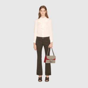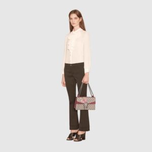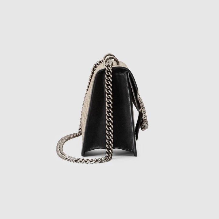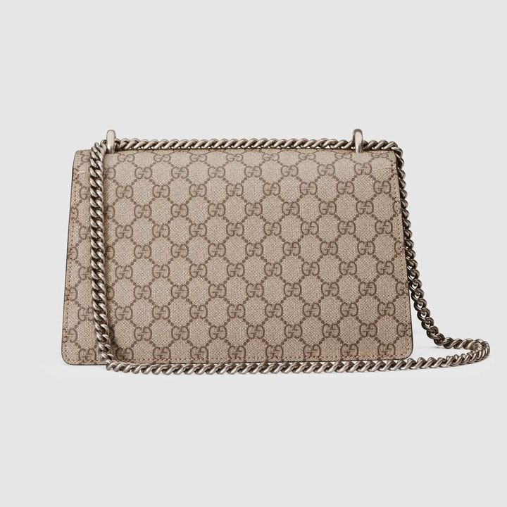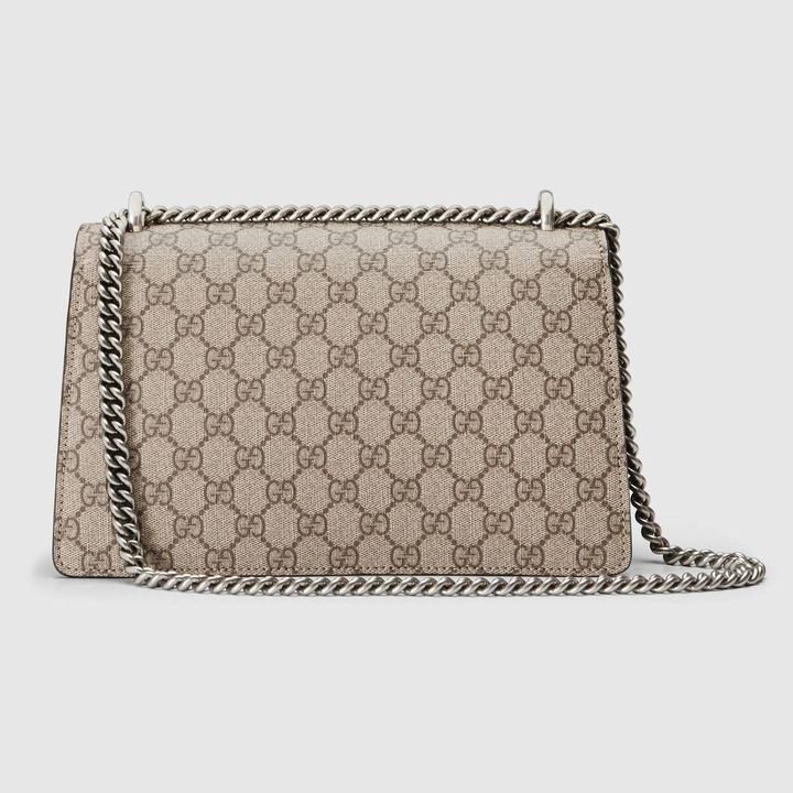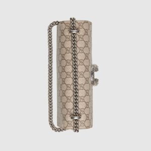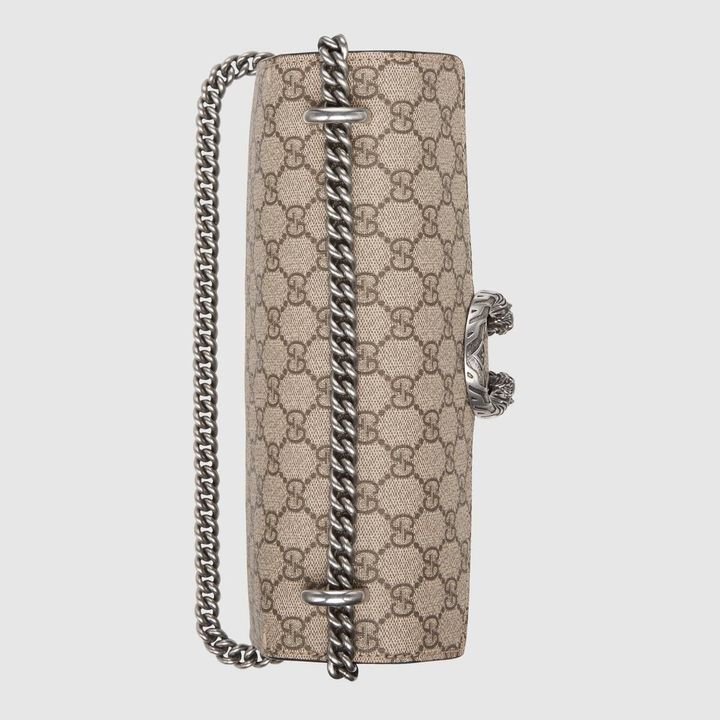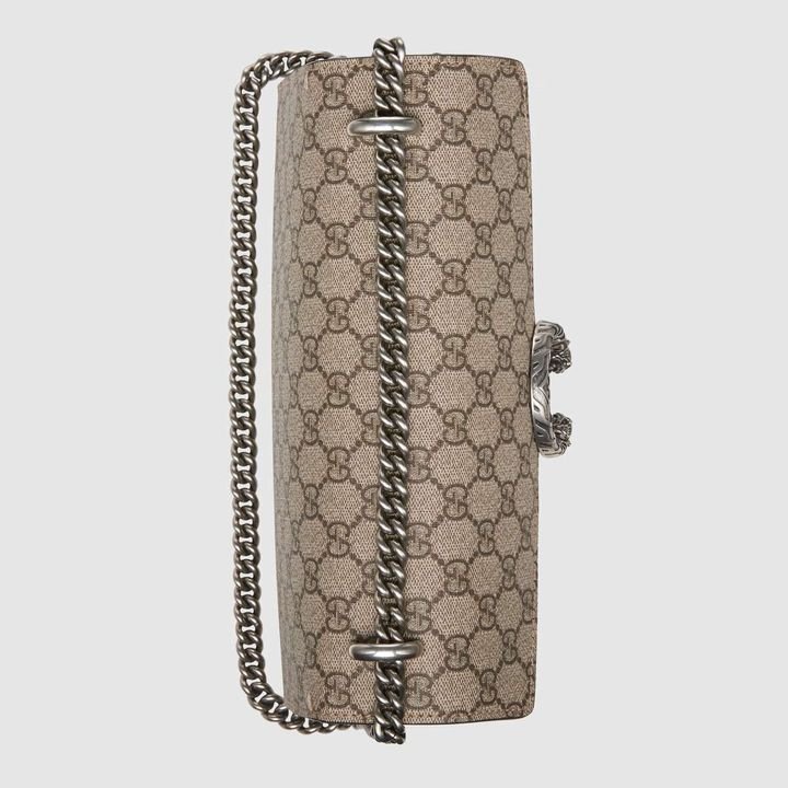 A structured GG canvas bag with our textured tiger head closure-a unique detail referencing the Greek god Dionysus, who in myth is said to have crossed the river Tigris on a tiger sent to him by Zeus. The sliding chain strap can be worn multiple ways, changing between a shoulder and a top handle bag.