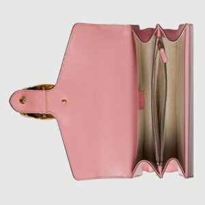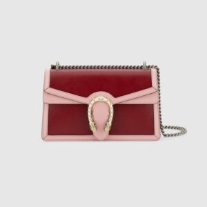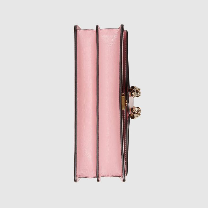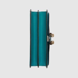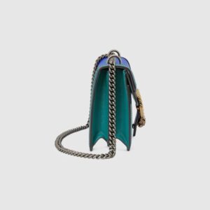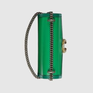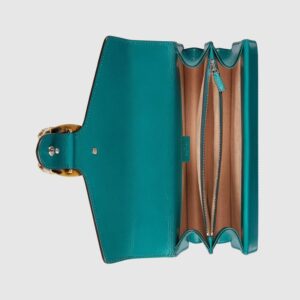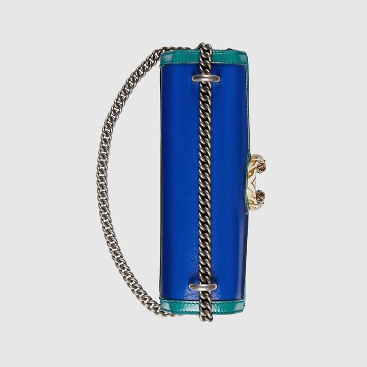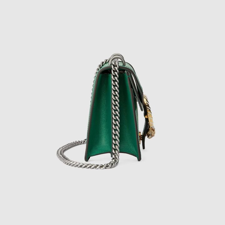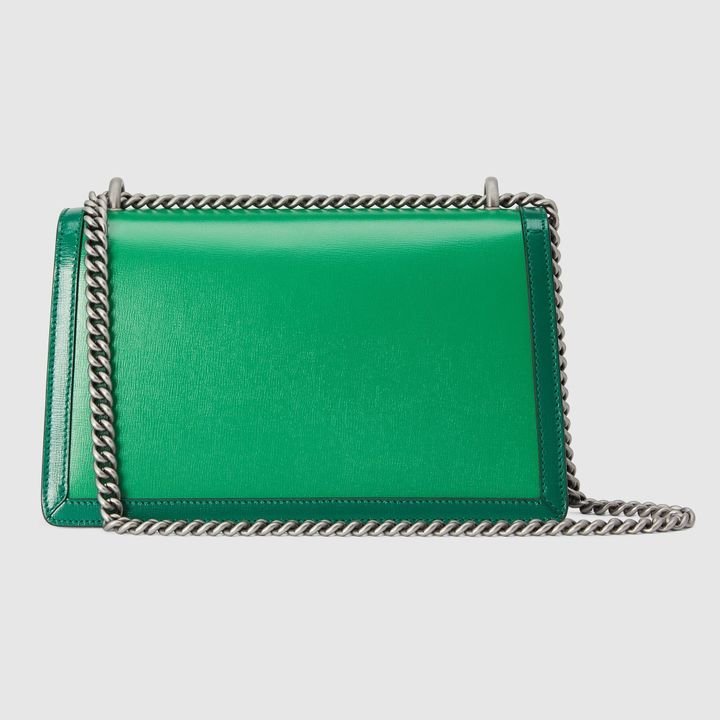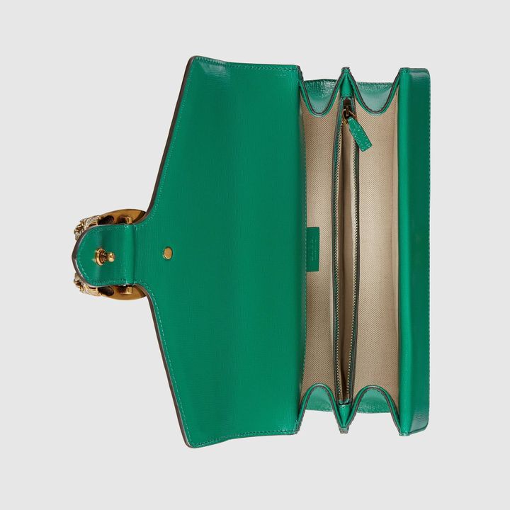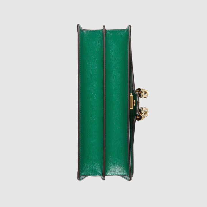 Signature styles from the Beloved lines are presented in vibrant colors that recall precious gems. Here the Dionysus is introduced in green leather with a gold-toned take on its emblematic tiger head closure. The textured hardware is further enhanced by shiny enamel