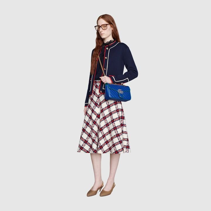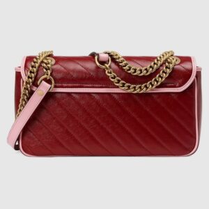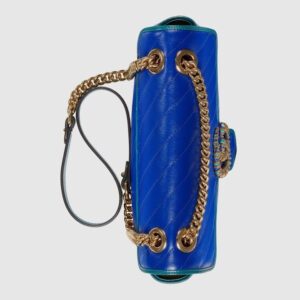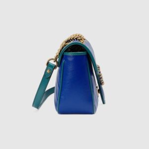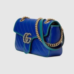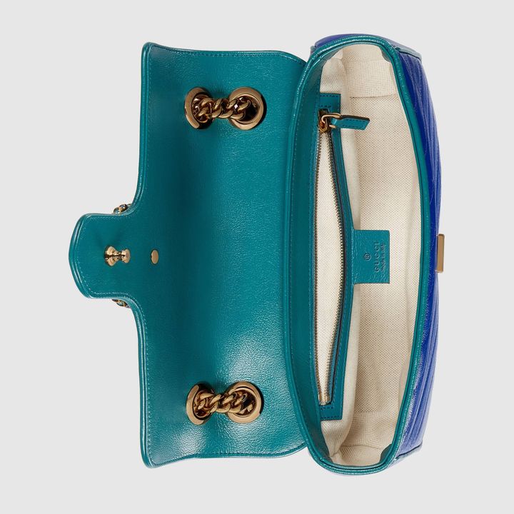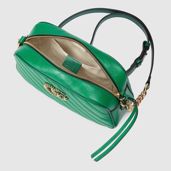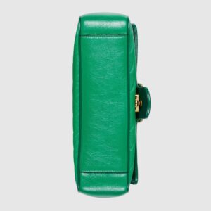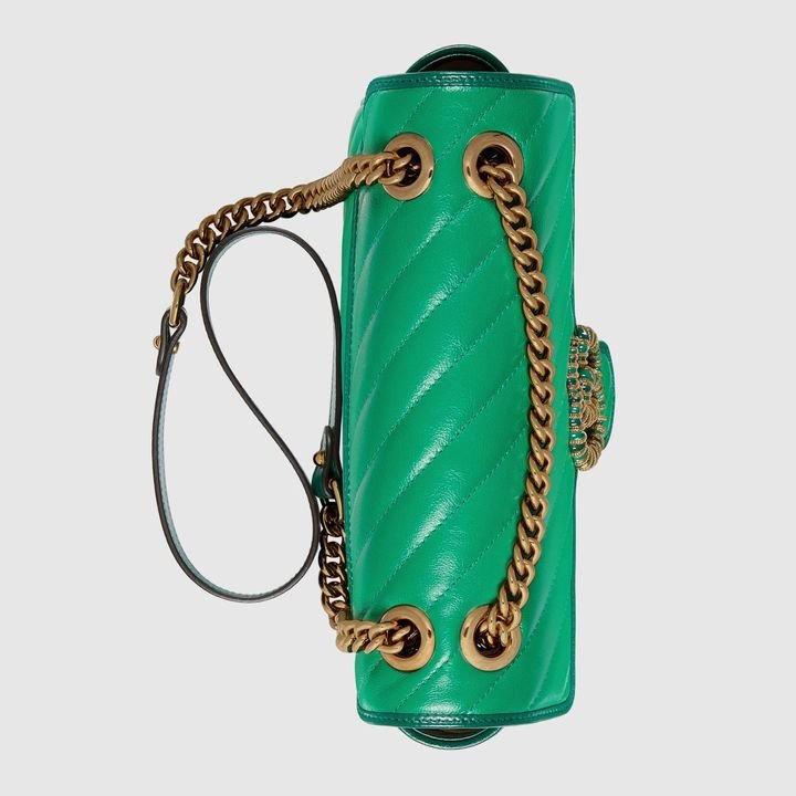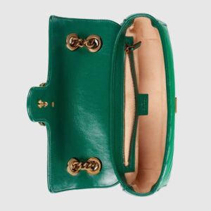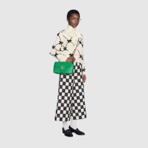 Signature styles from the Beloved lines are presented in vibrant colors that recall precious gems. Here the GG Marmont is introduced in emerald toned green leather with a diagonal matelass? finish. The shoulder bag is completed by its signature Double G hardware, enhanced by tonal enamel details.