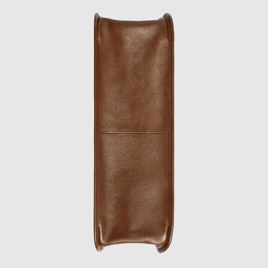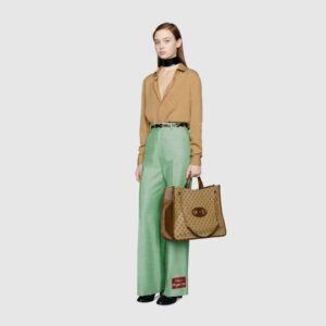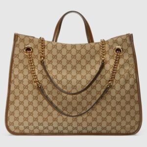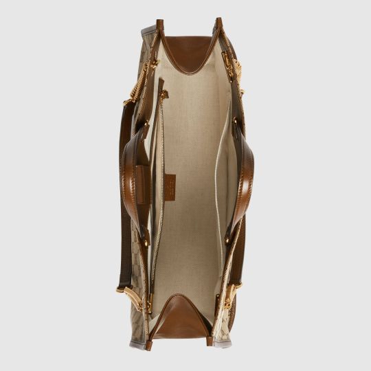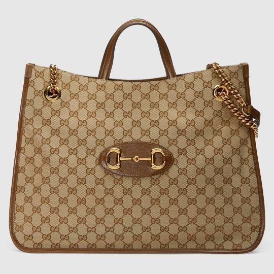 Designed with rounded edges and a soft shape, the tote bag is introduced to the Horsebit 1955 collection for Spring Summer 2020. Made from GG Supreme canvas with brown leather trim, the large double-handled silhouette has a chain shoulder strap that complements its modern spirit, finished with an organizational interior and magnetic snap closure. The collection unifies details first introduced on the original bag that inspired the line from over six decades ago with a modern spirit, highlighting the Horsebit. Part of Gucci?s genetic code, the double ring and bar design has been established as one of the most distinctive elements among the House symbols borrowed from the equestrian world.