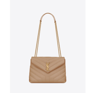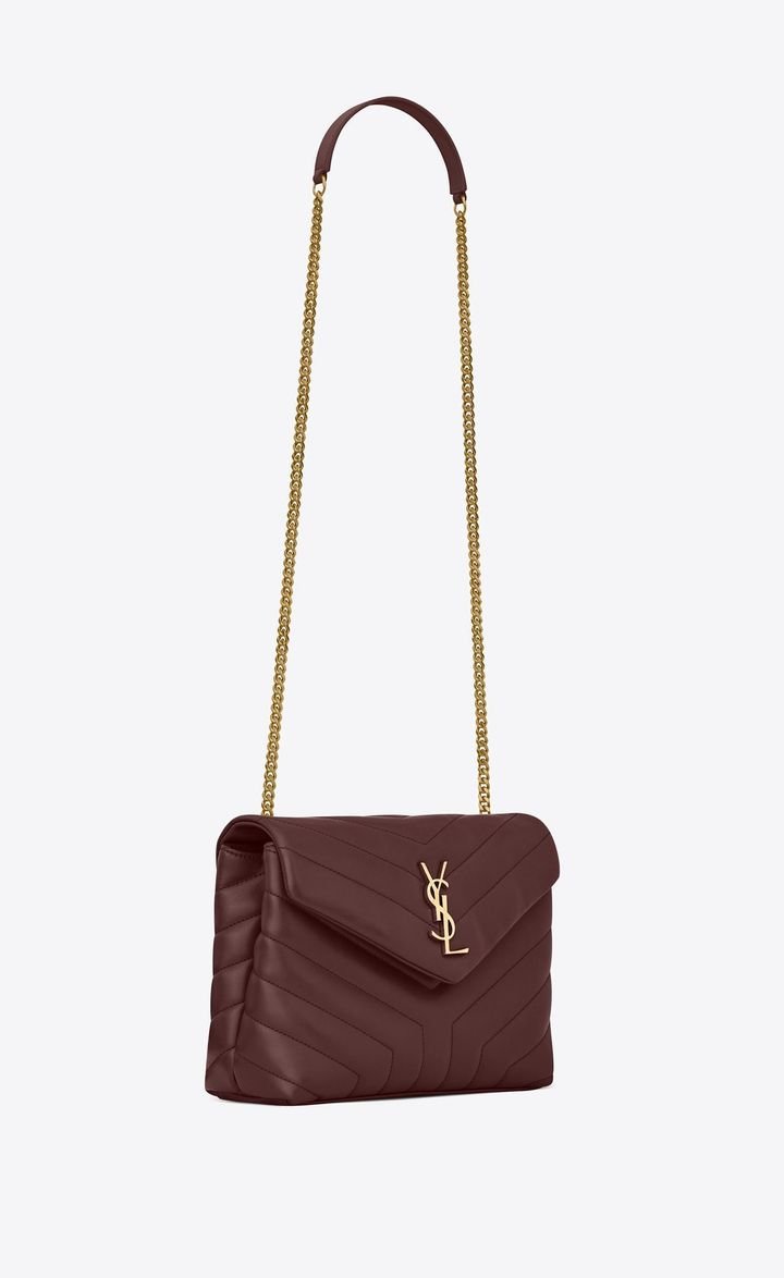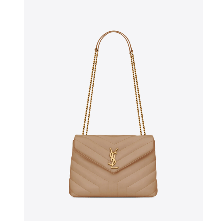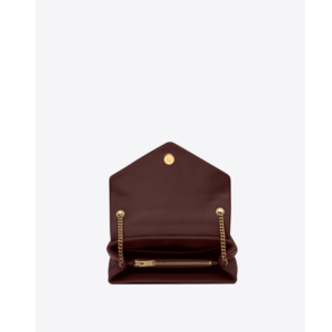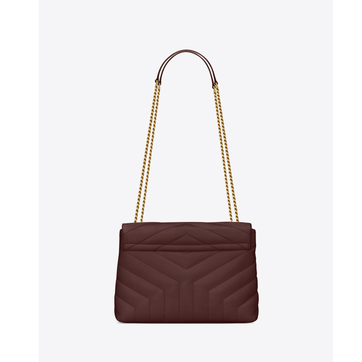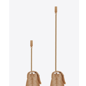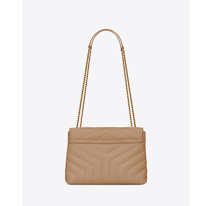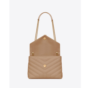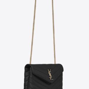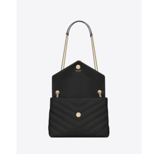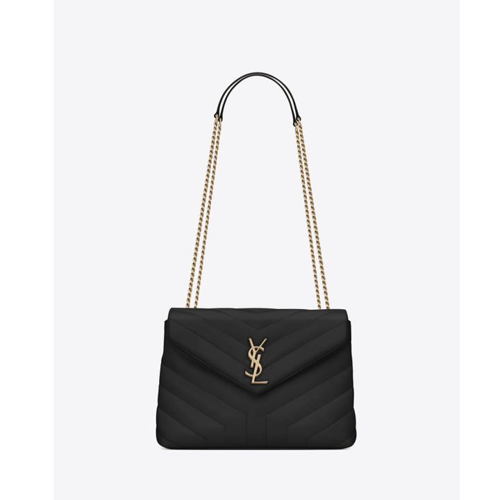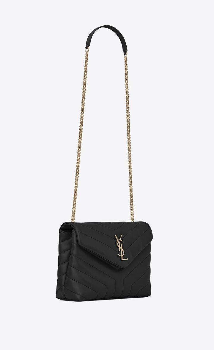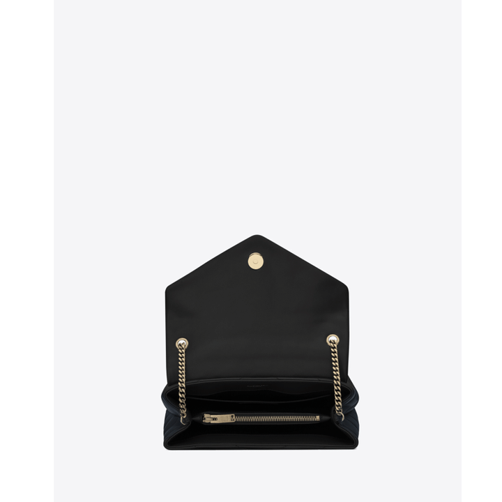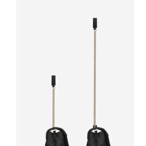Flexibly structured Saint Laurent monogram bag with front flap, featuring interlaced metal YSL initials, a leather and metal chain strap that can be worn doubled on the shoulder and ?Y? -quilted overstitching.