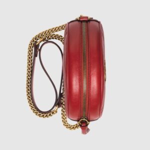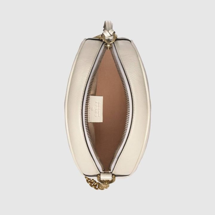 A new introduction to the GG Marmont line for Cruise 2019, the mini bag is presented in a rounded shape with a chain shoulder strap. Defined by the distinctive Double G hardware, made in matelass? chevron leather with a heart on the back, finished with a vintage effect.