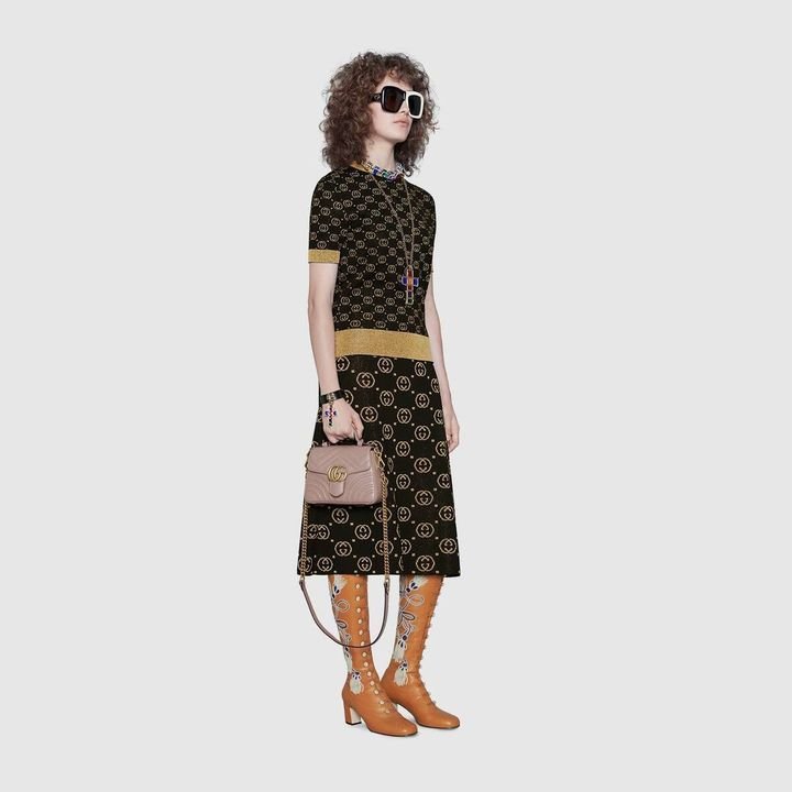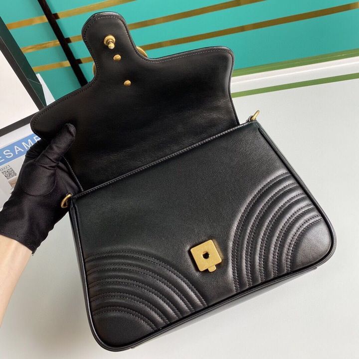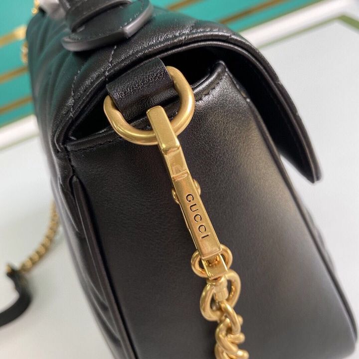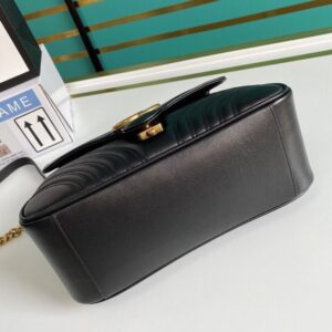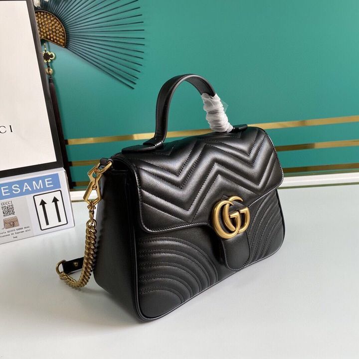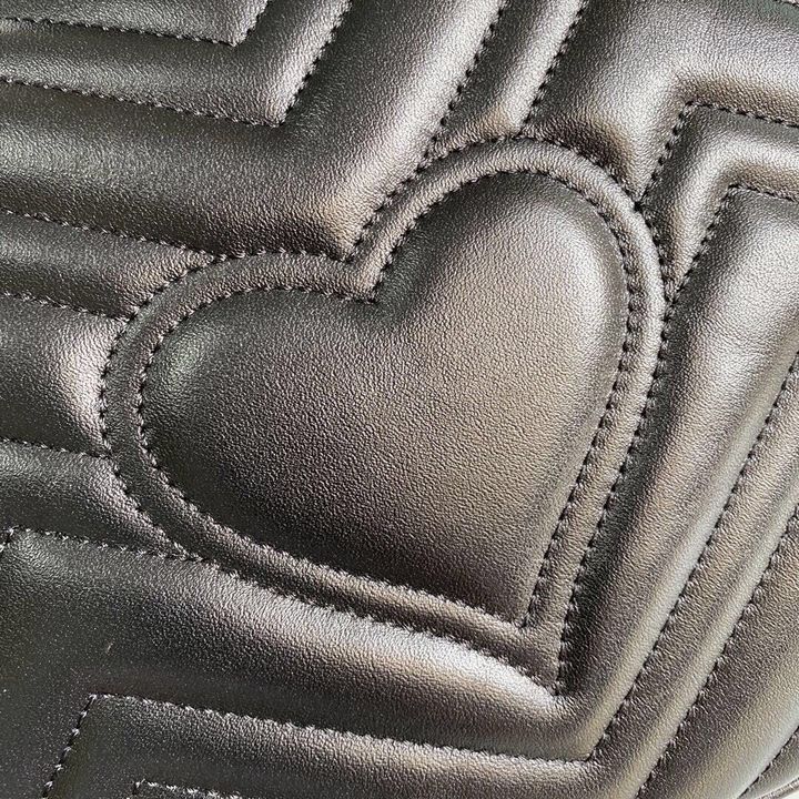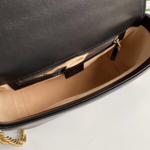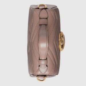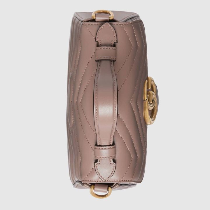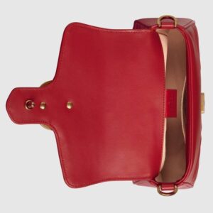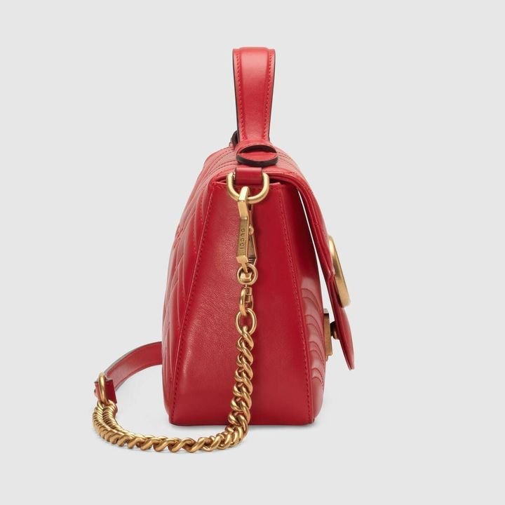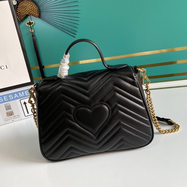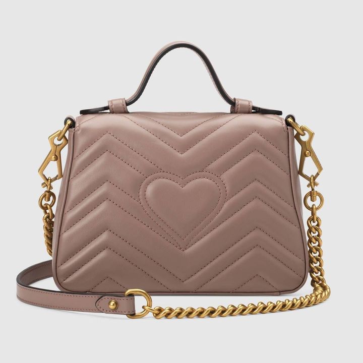 A new introduction to the Marmont line, the mini Marmont top handle bag has a softly structured shape and an oversized flap closure. Equipped with a leather top handle and chain shoulder strap, made in matelass? chevron leather with a heart on the back.