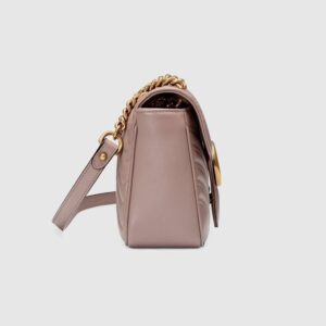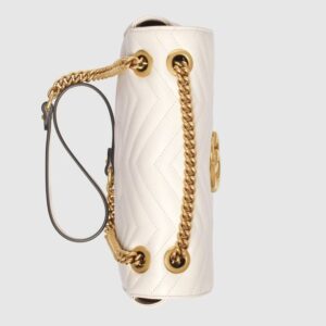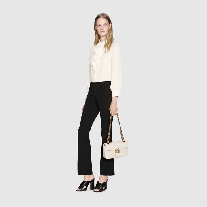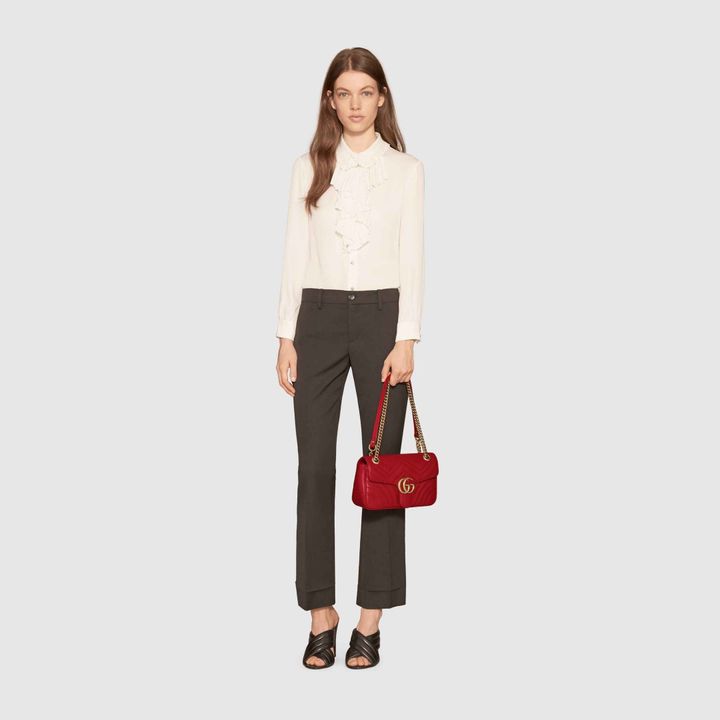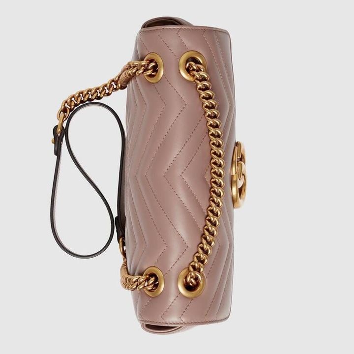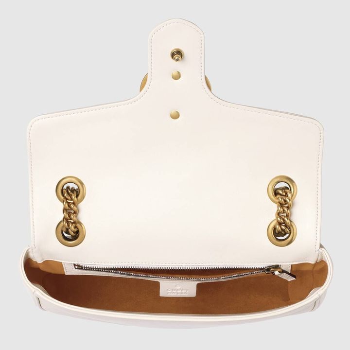 The small Marmont chain shoulder bag has a softly structured shape and an oversized flap closure. The sliding chain strap can be worn multiple ways, changing between a shoulder and a top handle bag. Made in matelasse chevron leather with a heart on the back.