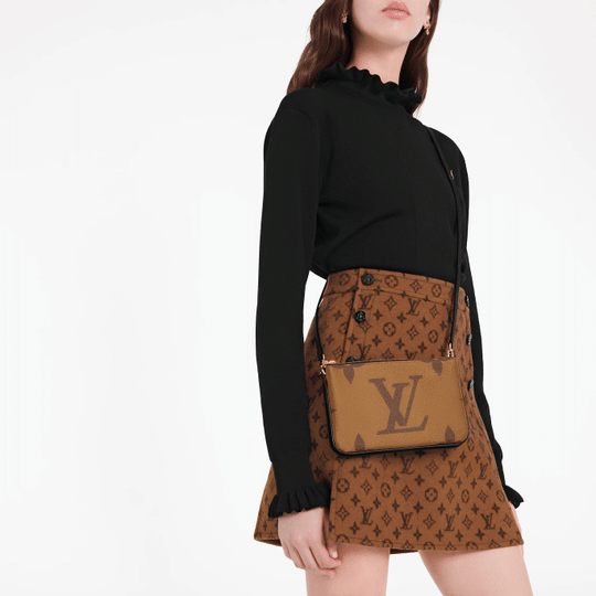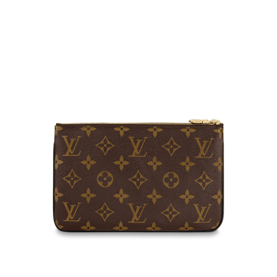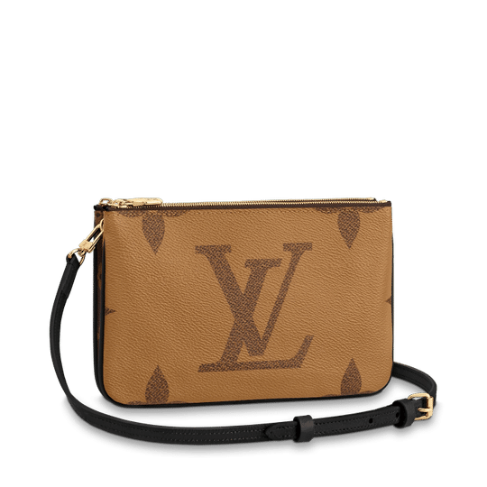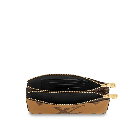 Timeless Monogram and on-trend Monogram Giant Reverse canvas combine on the Double Zip Pochette, which comes with a removable, adjustable leather strap for multiple carry options. This versatile pouch features two zipped pockets to organise everyday essentials, one of which contains three card slots. The middle space offers easy access to items like tickets.
