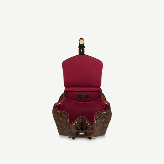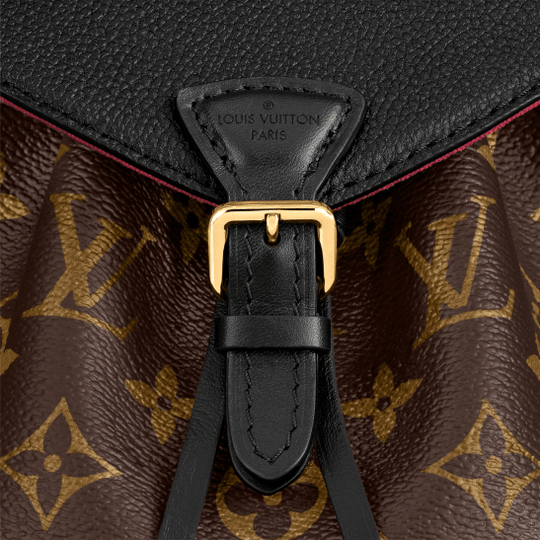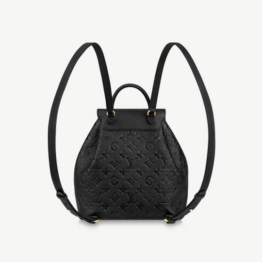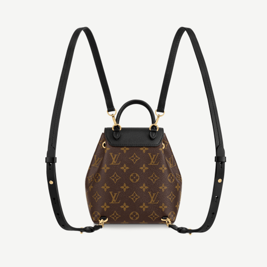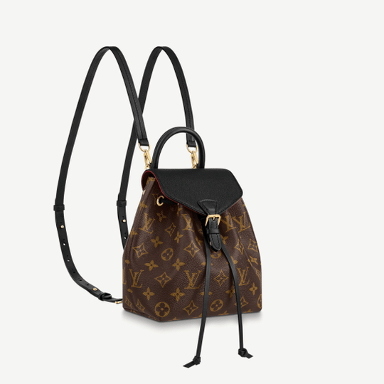 LV introduces the Montsouris BB Backpack in classic Monogram canvas and black cowhide leather for Winter 2020. This compact backpack is inspired by the original Montsouris from 1994, as can be seen in its gold-color buckle and leather drawstring, but its lines have been modernized. A top handle and removable adjustable leather straps allow multiple carry options.
