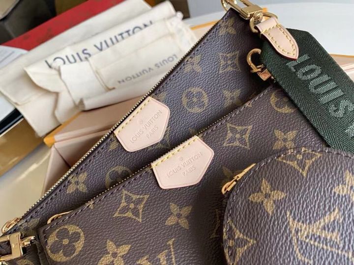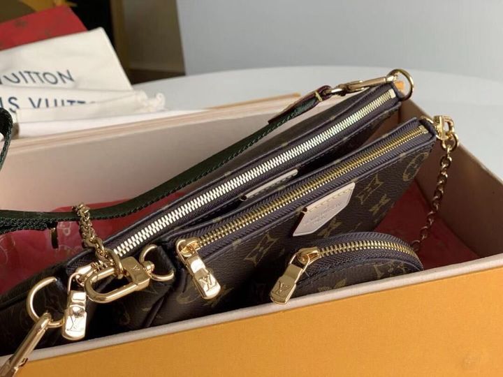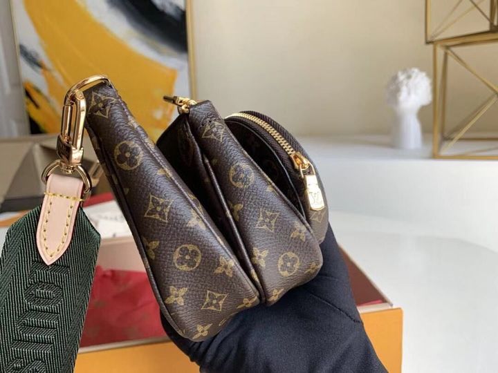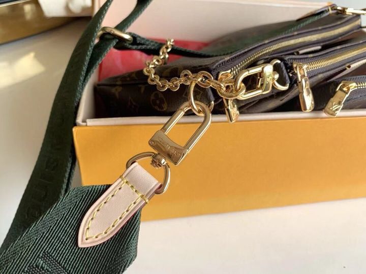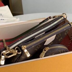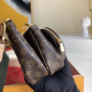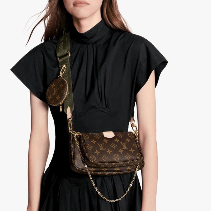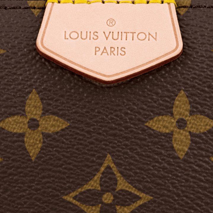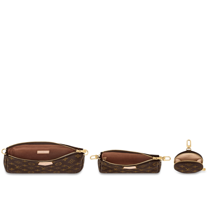 The Multi Pochette Accessoires is a hybrid cross-body bag with multiple pockets and compartments that brings together a Pochette Accessoires, a Mini Pochette Accessoires and a Round Coin Purse. Fashioned from Monogram canvas with a mini Monogram pattern on the sides of the two pochettes, it has both a removable gold-tone chain and an adjustable inscribed Jacquard strap for multiple carrying options.