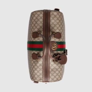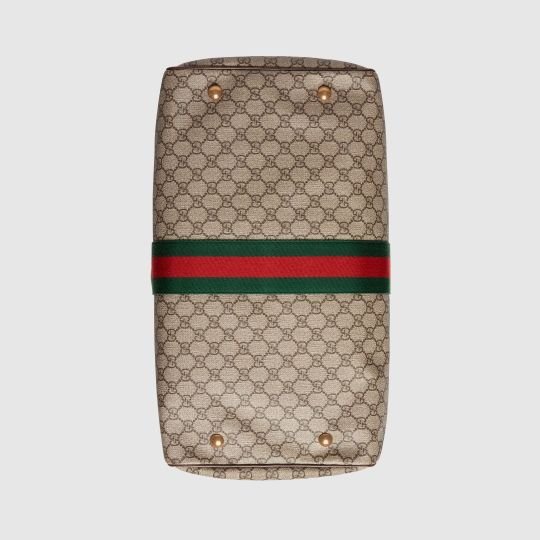 The world of Ophidia evolves with the introduction of a duffle shape crafted in soft GG Supreme canvas with inlaid green and red Web stripe. A contemporary take on a Gucci archival belt buckle from the ’70s, the Double G is repurposed and appears atop a textured leather tab detail. The carry-on is completed with a detachable and adjustable strap, lock with key holder and luggage tag.