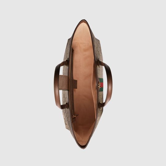 A classic combination of the House’s most defining codes?the GG motif and Web stripe?the world of Ophidia continues to evolve, incorporating new shapes and silhouettes each season. With recognizable design elements in a practical new shape, this new medium sized tote is trimmed with textured leather and topped with Double G hardware. Thanks to its long leather handles, the style can also be carried as a shoulder bag.