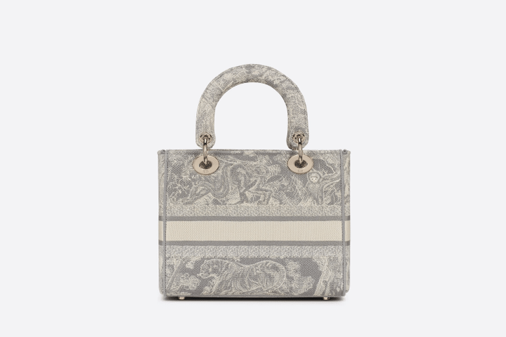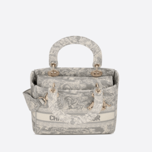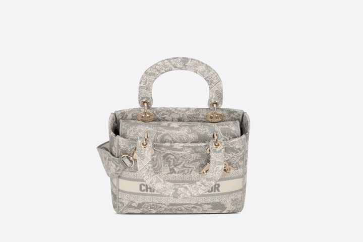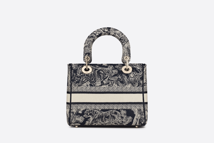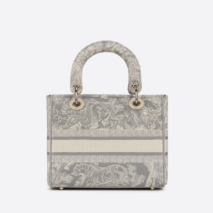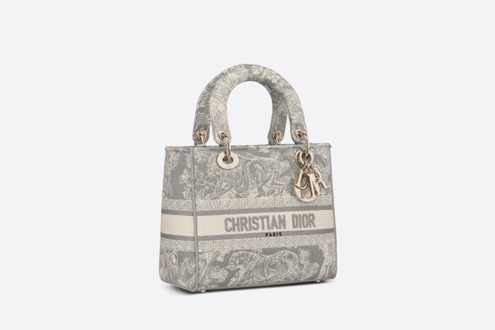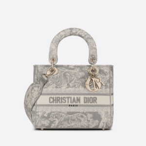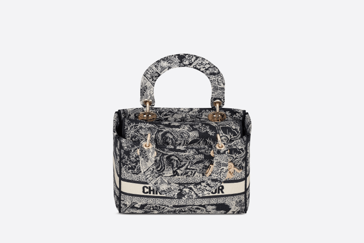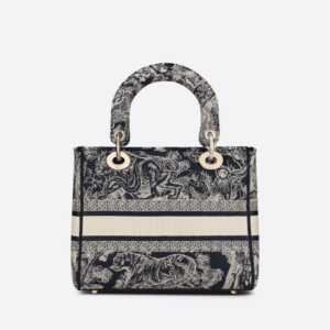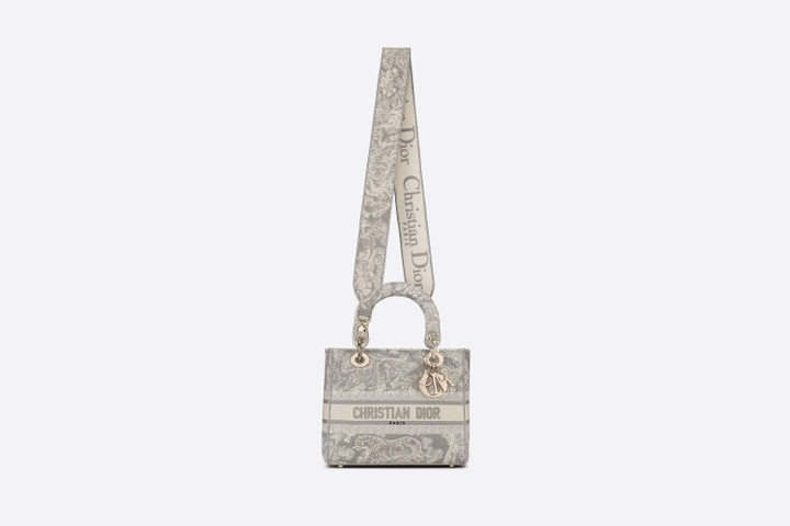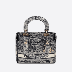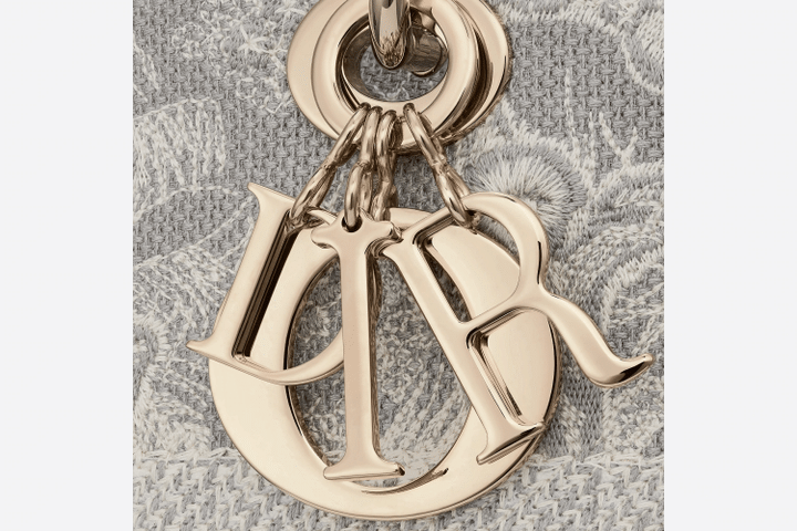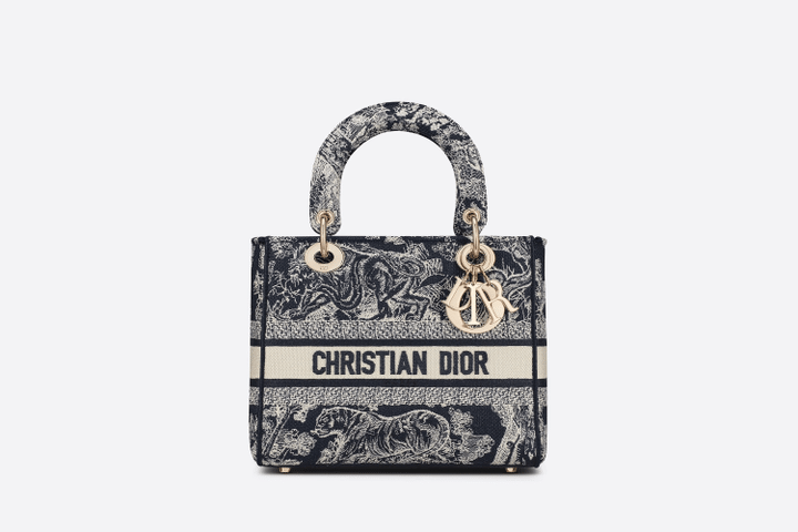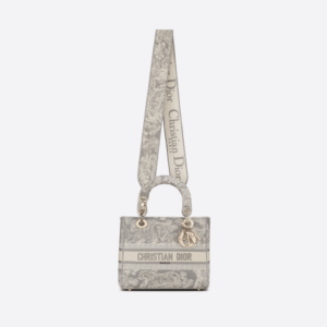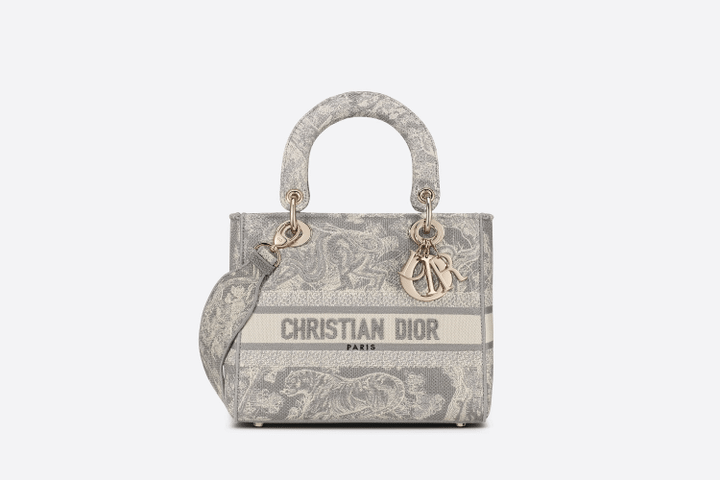 The Lady D-Lite bag combines classic elegance with House modernity. The style is fully embroidered with the Toile de Jouy Reverse motif, a variation of the hallmark House pattern with a play on reversed colors. The front features a ‘CHRISTIAN DIOR’ signature while the thick ‘D.I.O.R.’ charms in pale gold-finish metal enhance the silhouette. Equipped with a wide, reversible and removable embroidered shoulder strap, the medium Lady D-Lite bag can be carried by hand, worn over the shoulder or crossbody.