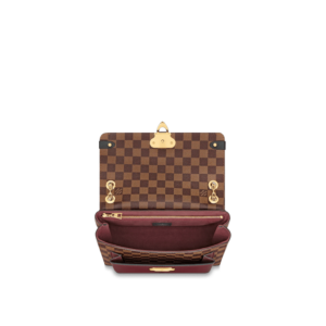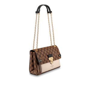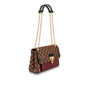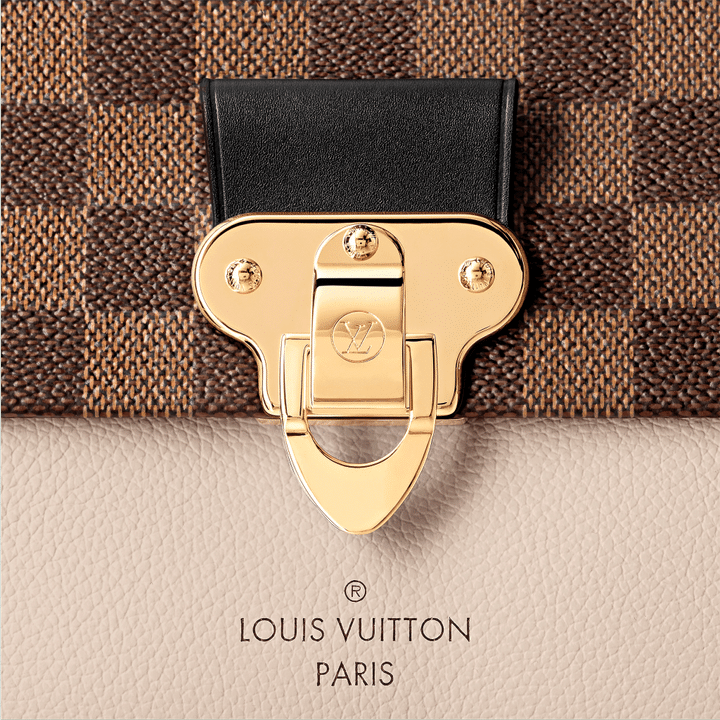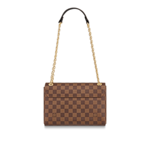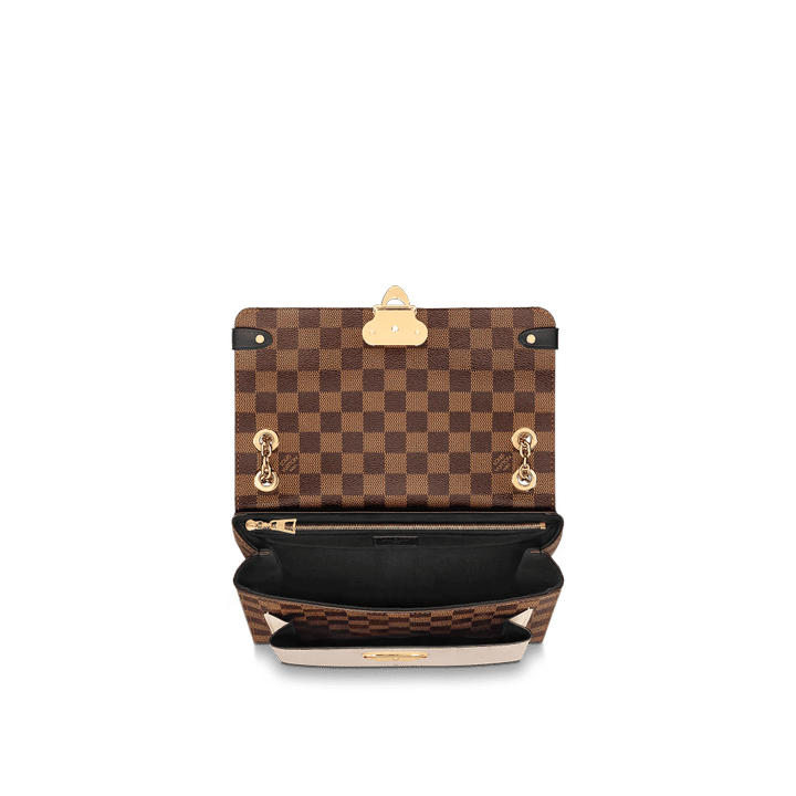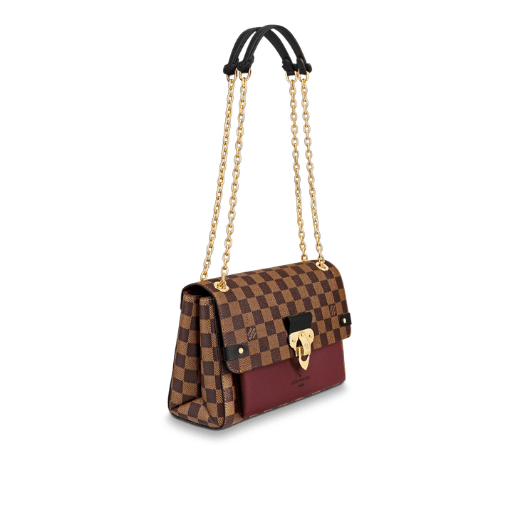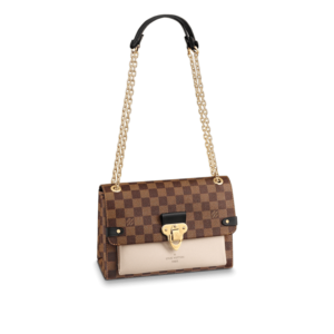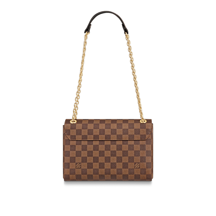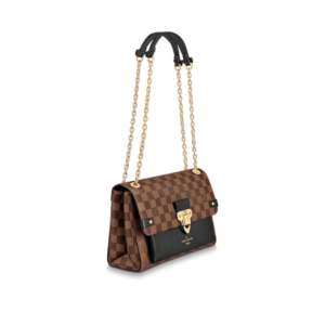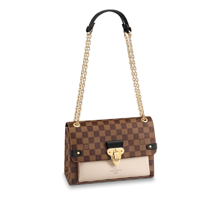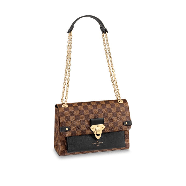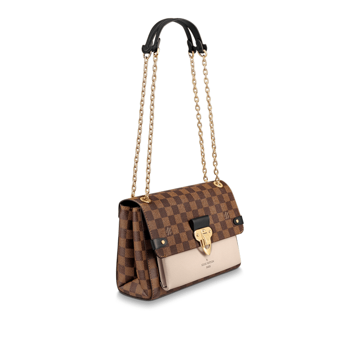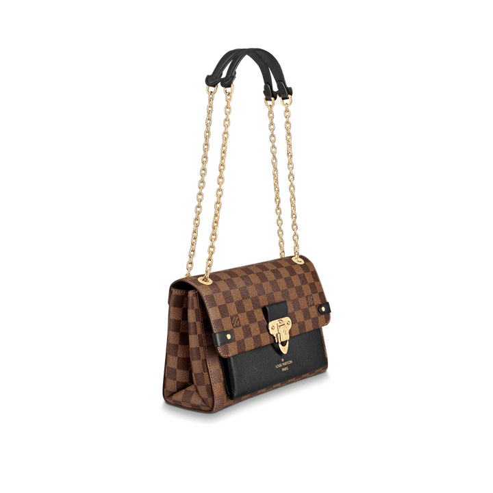 The Vavin chain bag is made from Damier Ebene canvas, elegantly balanced with soft calf leather. The golden-finish lock is inspired by those found on classic Louis Vuitton trunks. Light and body-friendly, the Vavin PM is suspended from a sliding chain handle fitted with twin leather shoulder pads, for a comfortable carry from day into evening.