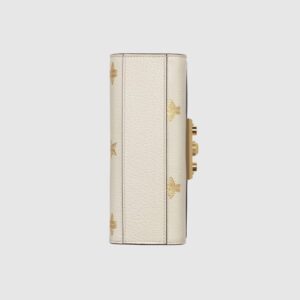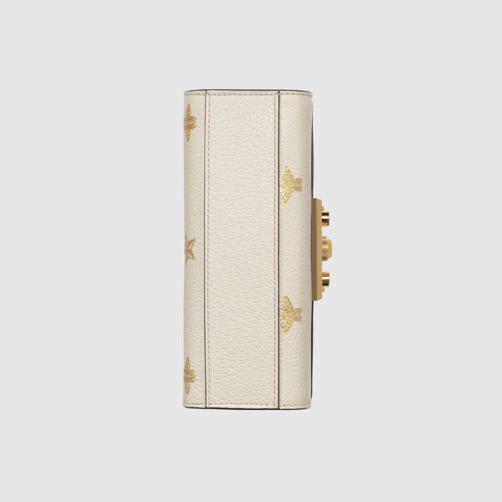 Characterized by structured silhouettes and a key lock closure pulled straight from the House’s archives, the distinctive Padlock shapes are revamped season after season. For Cruise 2019, the small shoulder bag is presented in textured leather printed with metallic gold bees and stars. The key is placed in a detachable leather key case.