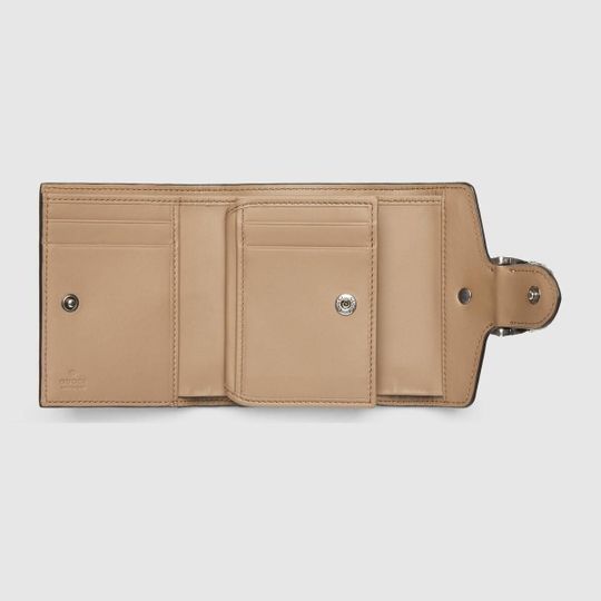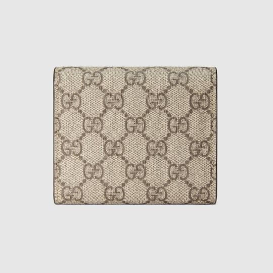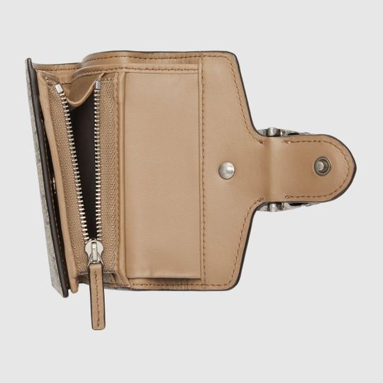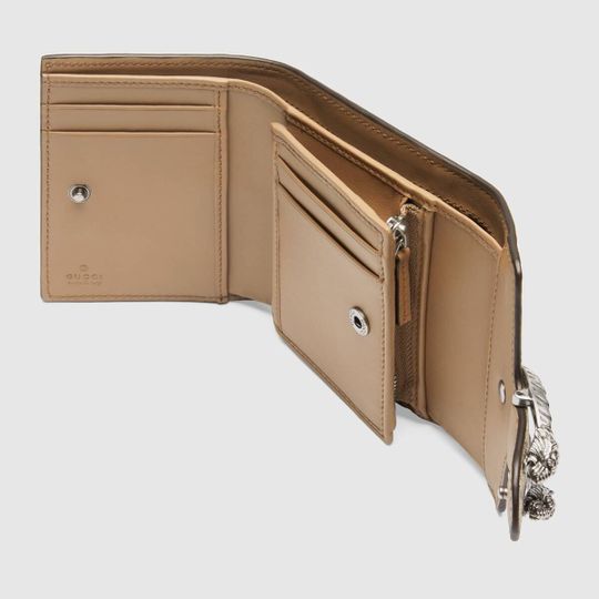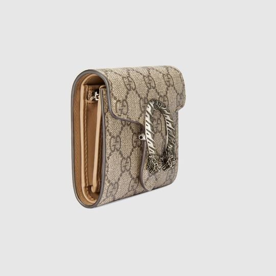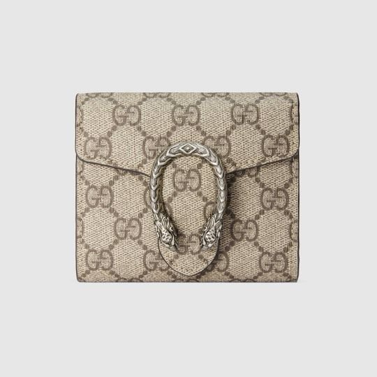 The Dionysus card case wallet is presented in the signature GG pattern, defined by the defining tiger head closure?a unique detail referencing the Greek god Dionysus, who in myth is said to have crossed the river Tigris on a tiger sent to him by Zeus.