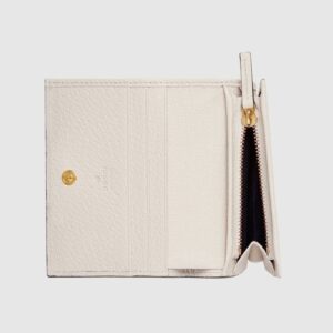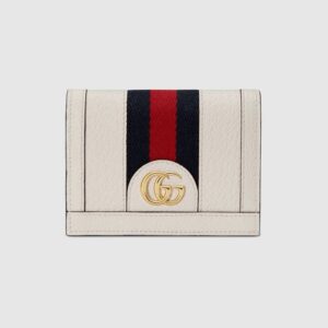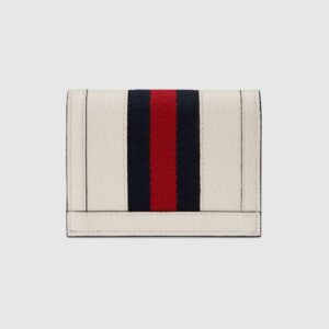 A black leather card case wallet enhanced by the House Web in green and red. The accessory is completed with a precious, tiny version of the archival Double G.
