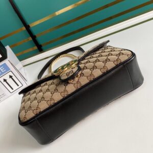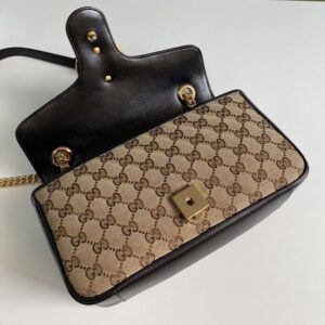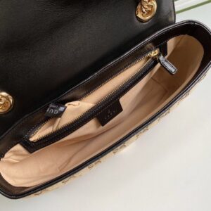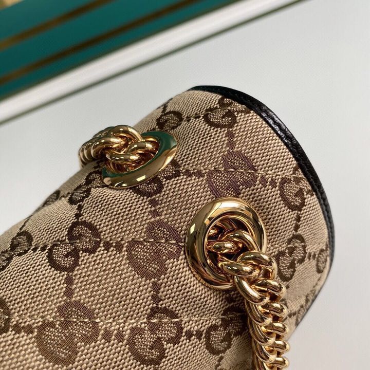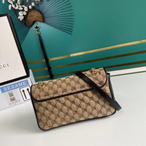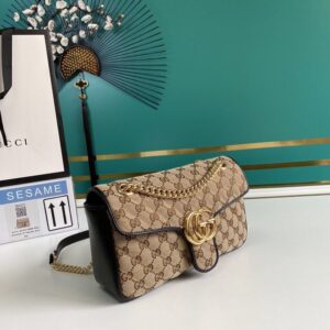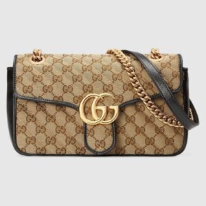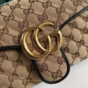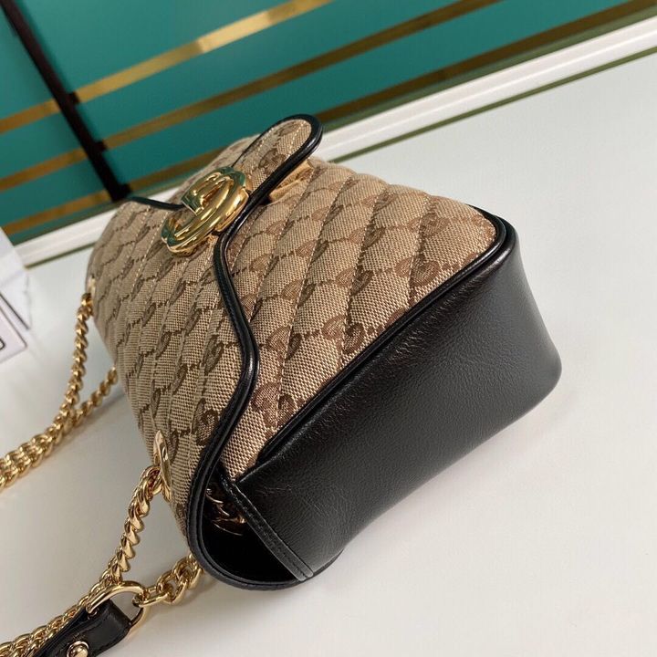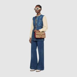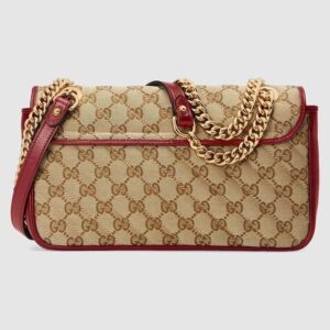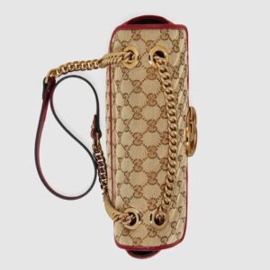 A statement accessory, reimagined with a strong logo connotation for Spring Summer 2020. Defined by the archival Double G hardware from the ’70s, the Marmont bag is presented in diagonal matelass? Original canvas?a timeless pairing that pays homage to the House’s heritage. The small chain shoulder bag’s distinct softly structured shape is outlined in contrast red leather trims, highlighting its flap closure. The sliding chain strap smoothly transforms from a single shoulder length to a doubled top handle length for multiple ways to wear the bag.